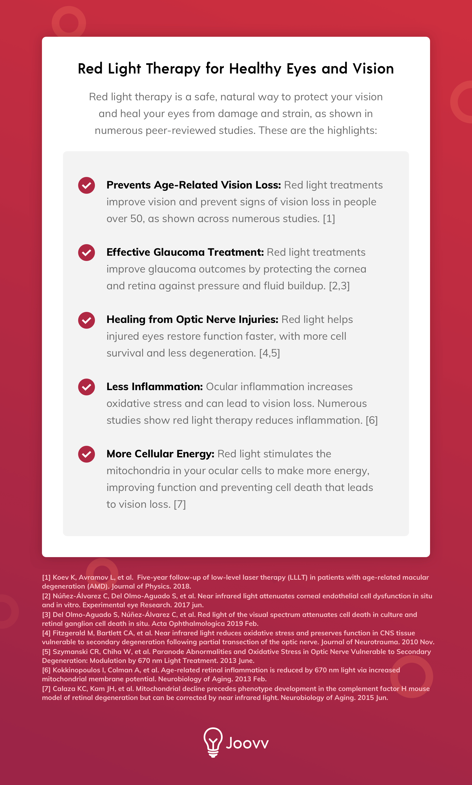 • More ATP Energy: Every cell produces ATP energy all the time to power your body. ATP is critical for cells to survive and function, and the stakes are especially high for ocular cells responsible for your vision. Several studies show that red light therapy increases ATP production in eyes. [4,5]