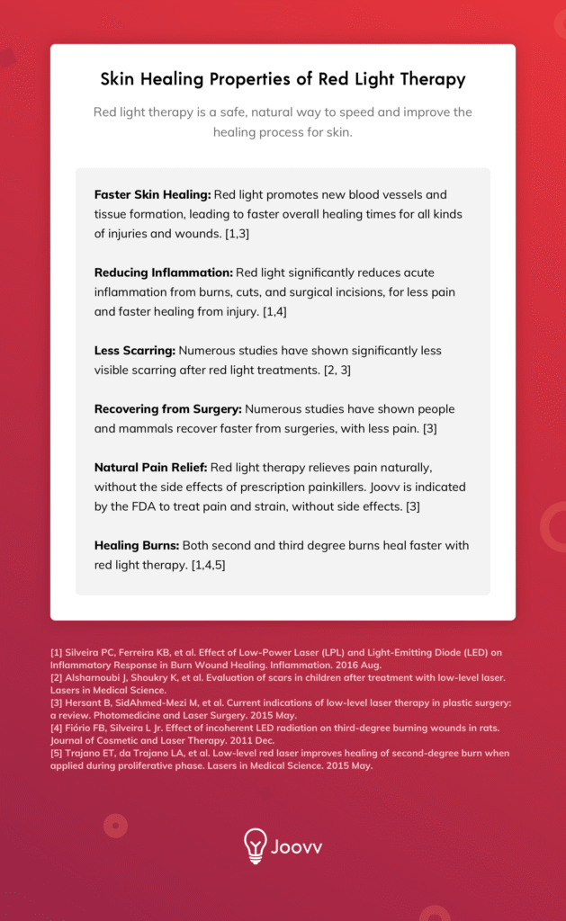 Red light therapy is a safe, natural way to speed up the healing process for burns, wounds, surgery incisions, and scars, as shown in numerous peer-reviewed clinical studies. Patients recovering from injuries and medical procedures have experienced much less pain and inflammation, with faster healing results, when using red light treatments.