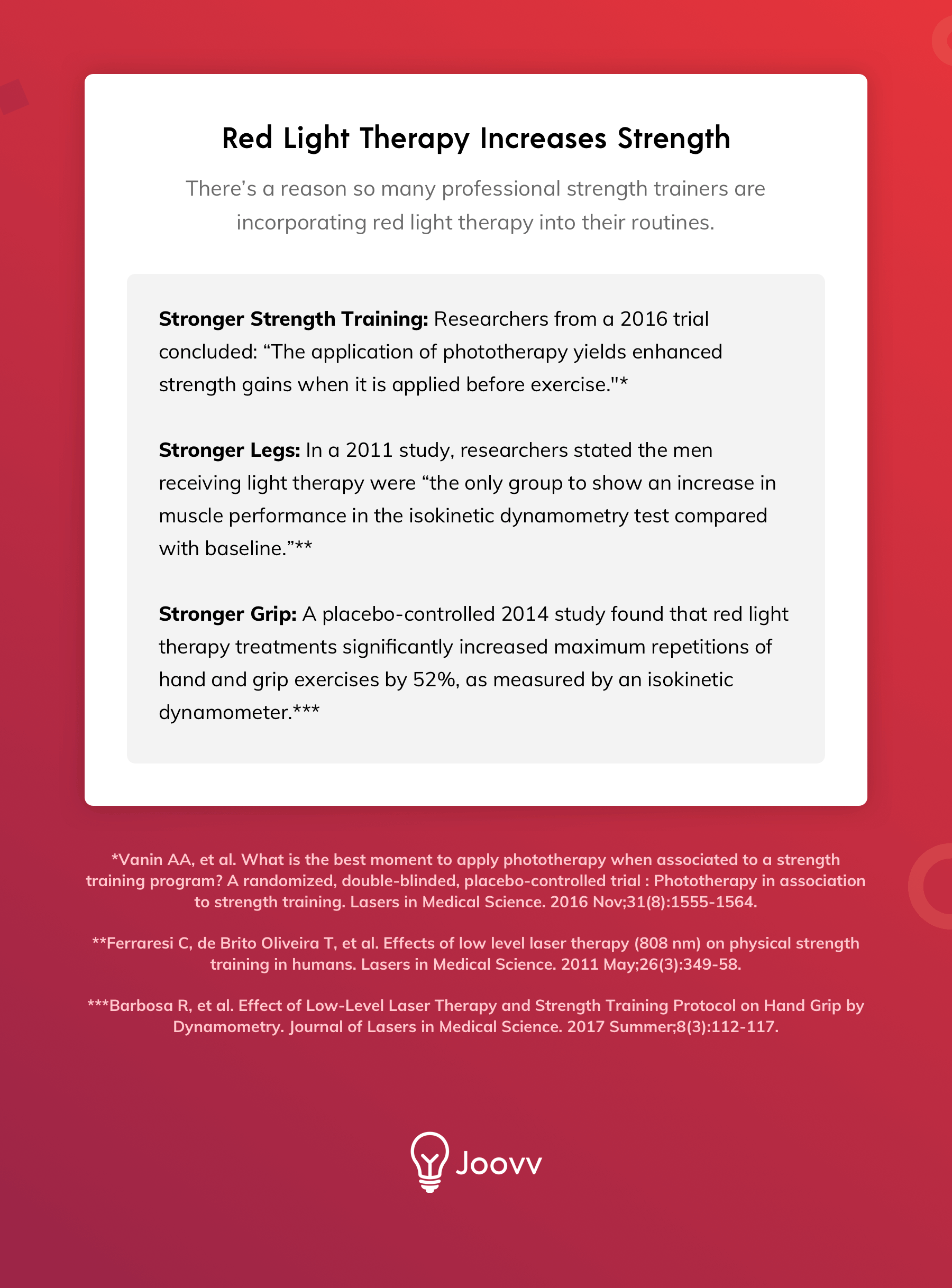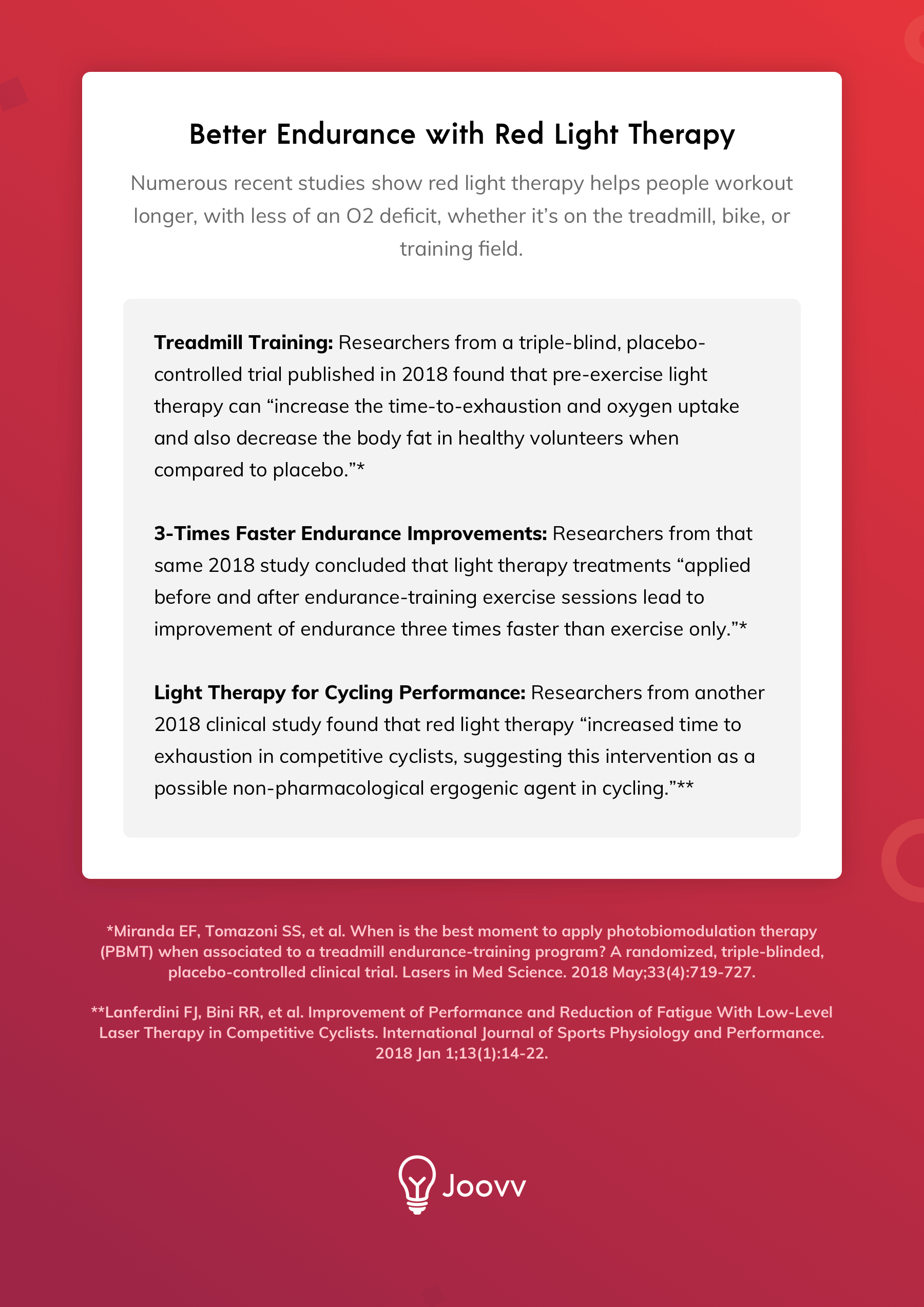[1] Leal-Junior EC, Vanin AA, et al. Effect of phototherapy (low-level laser therapy and light-emitting diode therapy) on exercise performance and markers of exercise recovery: a systematic review with meta-analysis. Lasers in Medical Science. 2015 Feb;30(2):925-39.