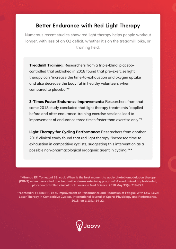 Numerous recent studies show red light therapy helps people workout longer, with less of an oxygen deficit, whether it’s on the treadmill, bike, or training field. These are recent clinical results in published, peer-reviewed trials from around the world: