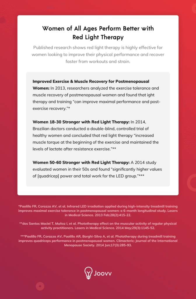 Several of the studies mentioned so far analyzed the physical performance of male athletes, but clinical research is just as positive for women of all ages and fitness levels. The published research shows red light therapy is highly effective for women looking to improve their physical performance and recover faster from workouts and strain.
