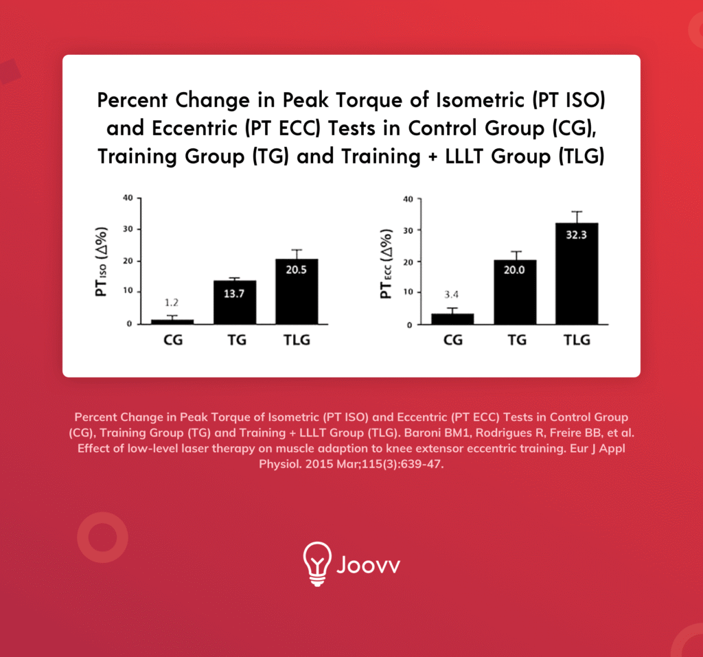 A separate study in the European Journal of Applied Physiology compared muscle growth and strength between two groups of athletes—one using light therapy combined with exercise, the other using exercise alone—and found that muscle thickness and strength were significantly improved (by over 50%) in those who used light therapy. These results were clearly measurable using ultrasound imaging and isokinetic dynamometry, as shown in the graph below. [18]